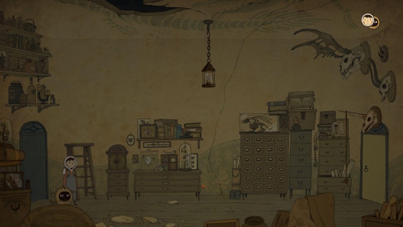 この部屋は暗いですが、ランタンにはまだ手が届きません。ウリを一番右に動かし、ドアの上の頭蓋骨の角からぶら下がっている紐を引っ張ってください。