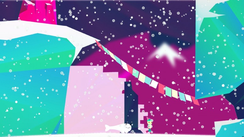 ここには、2 つの高い棚と結晶構造があります。シールを再充電し、棚の助けを借りて、できるだけ上に行きます.封印を再び充電し、色付きの祈りの旗を過ぎて右に進みます。反対側には、別の結晶構造と恐ろしく長い裂け目があります。アザラシを充電して、右上にできるだけ遠く、高く飛んでください。アザラシの汁がなくなる頃には、安全に雪の地面にいるはずです。