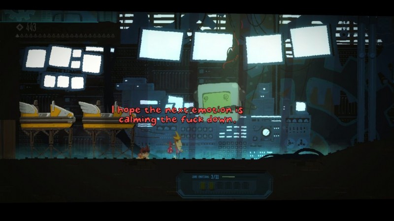 これは非常に短いので、左に進み、チェックポイントの横にある 5 つの時限ブロックを下ります。右に進みます。目でブロックを踏むことができるので注意してください。ただし、すぐに爆発して赤いものになります。スパイクに落ちないように下に降りてから、左に移動して、回転するブロックの側面にスパイクが来るのを待ちます。上にジャンプして左に行き、RAM をつかみます。