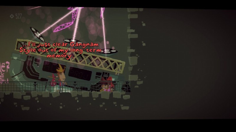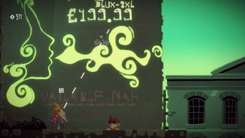 ここから、蒸気を吹く女性の大きなネオンサインのあるプラットフォームに降りてください。ベンに切り替えて、ダンの位置にテレポートします。遠くを見る能力 (デフォルトでは右クリック) を使用して、ネオンサインを調べます。これで、現代の専門用語の別の単語を学習しました。