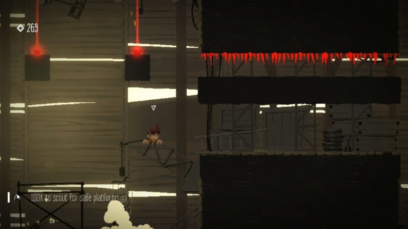 ここで、別のプラットフォーム セクションに遭遇します。これは前のものよりも難しいです。これを左に進み、左の壁に到達したら上に向かいます.次に、レーザーとスパイクを避けて右に進みます。