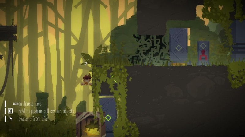 新しいダブル ジャンプ ブーツを履いて、ダンは不気味なブドウの木の上の台に飛び乗ることができます。そこからすぐに進み、シアン ガスの上の高いプラットフォームにジャンプします。まだボタンを踏まないでください。