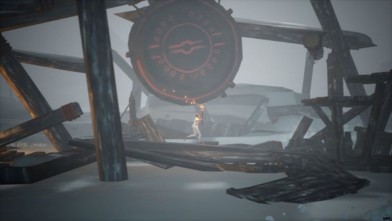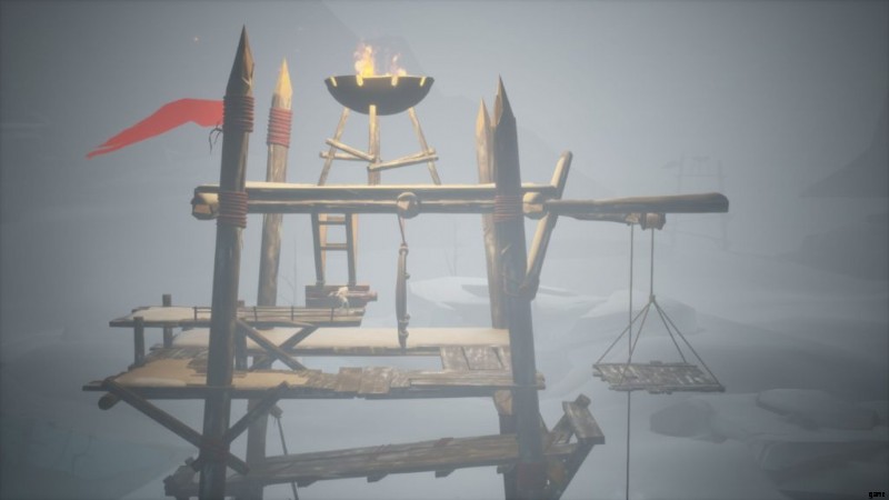 右に行くと別の炎に到達します。炎を通り過ぎ、右に進み、木製のプラットフォームを通り過ぎて、雪の小さなパッチを飛び越えます.少し露出した岩の上にトーチがあります。それをつかみ、炎に戻します。たいまつに火をつけて、2回通り過ぎた木製のプラットホームを上ります。ゴングのすぐそばに行き、赤いロープに火をつけてください。