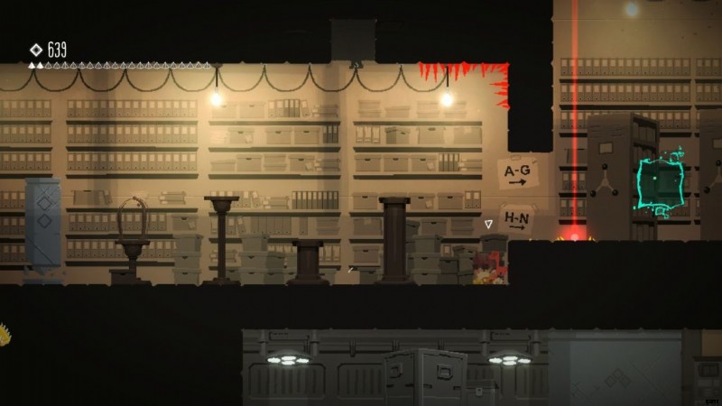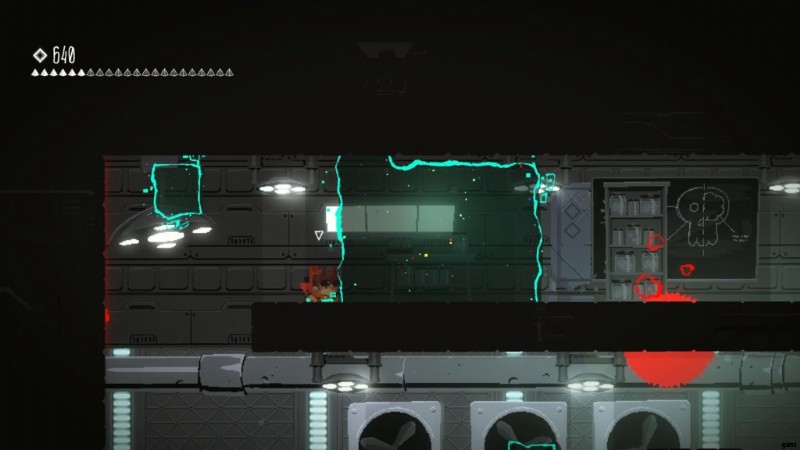 ダンとして次の部屋に向かいます。この部屋はちょっと難しい。重力の裂け目のために飛び回っている間に、赤いものをクリアする必要があります。最初のグラビティ リップを回避できます。赤いものを片付け、右にジャンプしてプラットフォームを上ってください。上向きの 2 番目のグラビティ リップを使用すると、反転します。