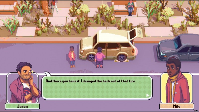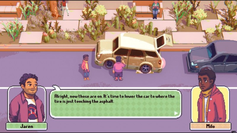 ツールを入手したら、マイロの車のパンクしたタイヤ (車の前部のタイヤ) を調べると、Jaren は何らかのウェッジが必要だとコメントします。