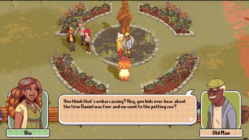 ティーンエイジャーを動かすために 、まずティーンエイジャーと話しに行きます。彼らと会話した後、画面の北に行き、アヒルに餌をやる老夫婦を見つけ、その夫婦と話してください。