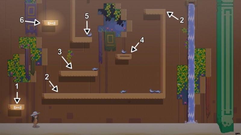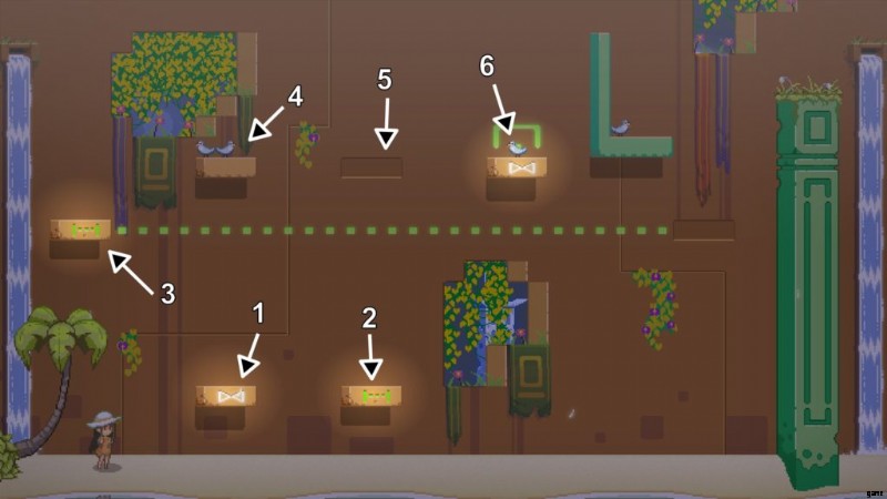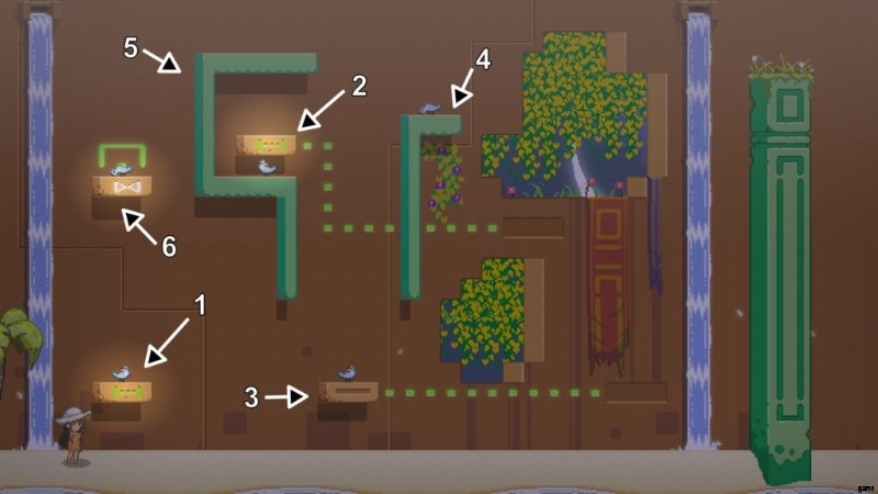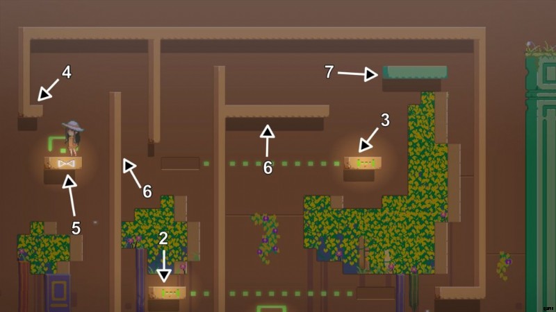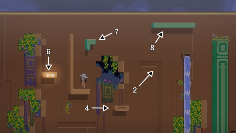 6 のトグルにジャンプします。ここから 3 にドロップしてから、もう一度 4 にジャンプし、ランチを使用して 5 に移動します。5 から 4 に戻り、ランチを使用して 2 の上部に移動します。