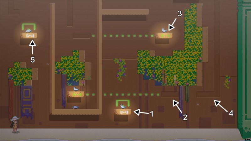 1 に 2 回ジャンプして 4 を有効にします。2 にジャンプして 3 にテレポートし、4 にジャンプします。4 にジャンプして 1 にドロップダウンします。これにより、4 と 5 の両方が有効になります。