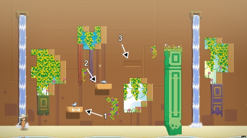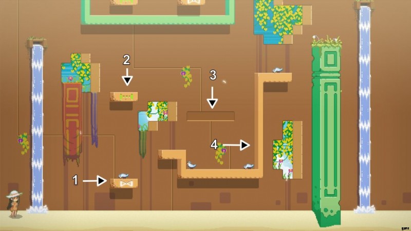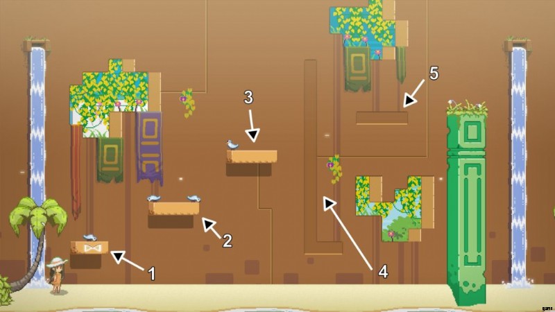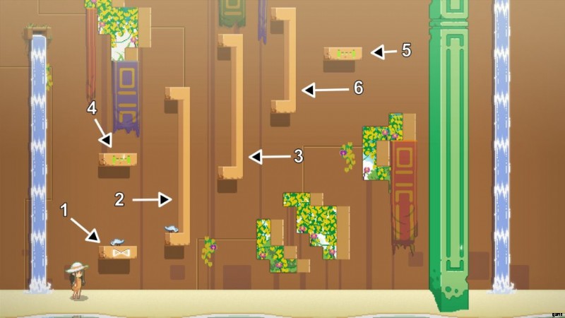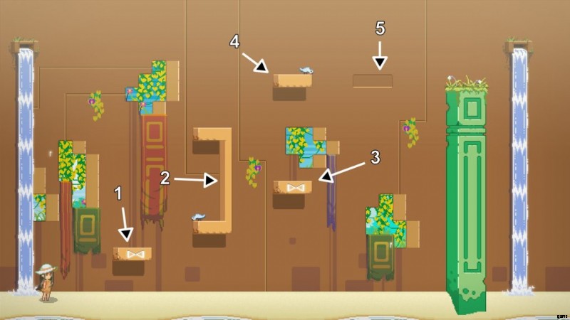 これで、1 から 2 と 3 を経て 5 に至る明確な道ができたはずです。1 に 2 回ジャンプしてブロックを再度有効にし、プラットフォームにジャンプして緑の柱に到達します。