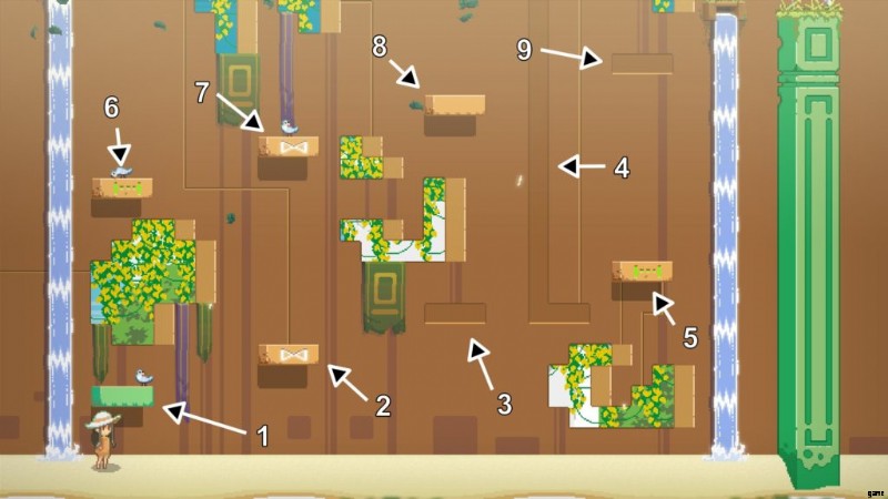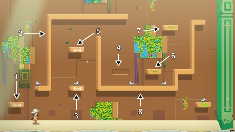 1に2回ジャンプして2を有効にする. 2にジャンプして右に3にジャンプ. 4にジャンプし、次に左にジャンプして5にジャンプ. 8に触れずに4に戻る. 6でテレポーターにジャンプして7に移動. 次に、8 の上部にある緑色の柱にジャンプします。