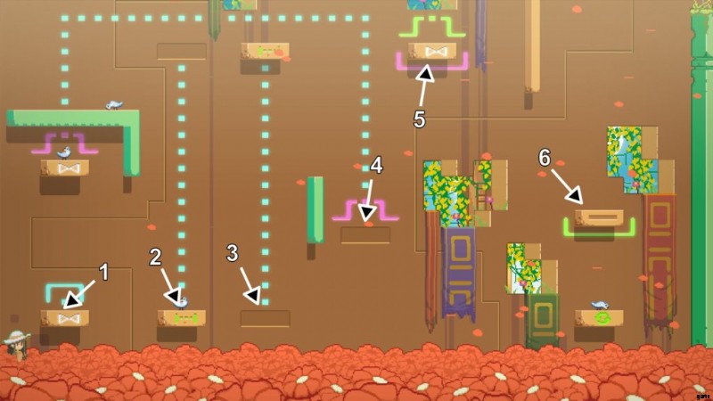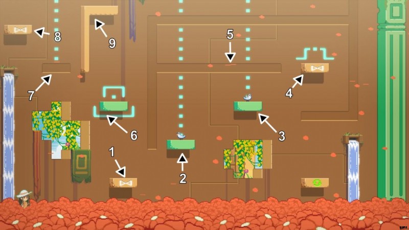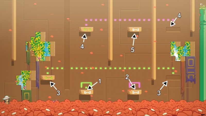 2 で所定の位置にジャンプして 1 と 3 を無効にし、4 と 5 をアクティブにします。2 から 4 に慎重に大きくジャンプします。5 にジャンプし、次に緑の柱にジャンプします。