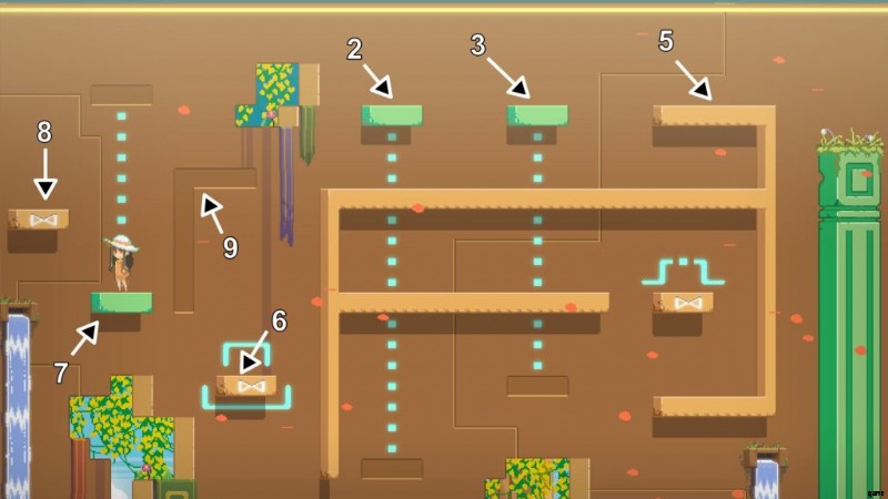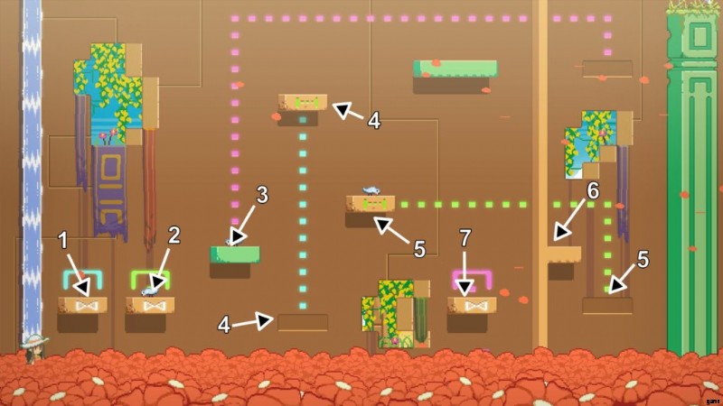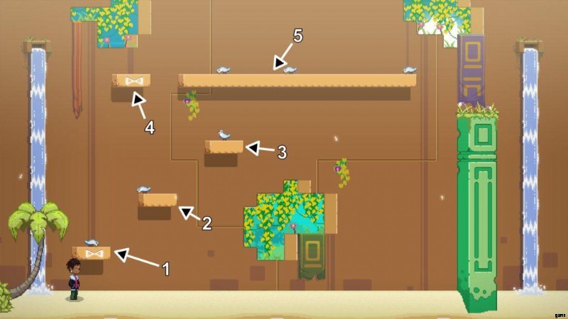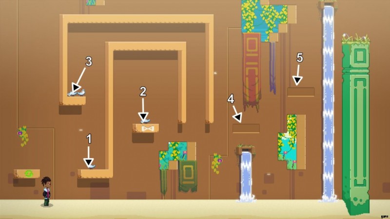 5 にジャンプし、2 に着陸するためにドロップダウンします。3 にジャンプして 4 に移動し、緑色の柱にジャンプします。