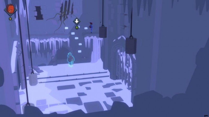階下に戻り、緑のアーチ道を通り抜けると、壁にひび割れがあり、上にレンガがいくつかあります。前と同じように、壁の割れ目にピトンを使用してから、トーベに切り替えてレンガを登らせます。彼女が起きたら、果物を手に取り、降りてください。
