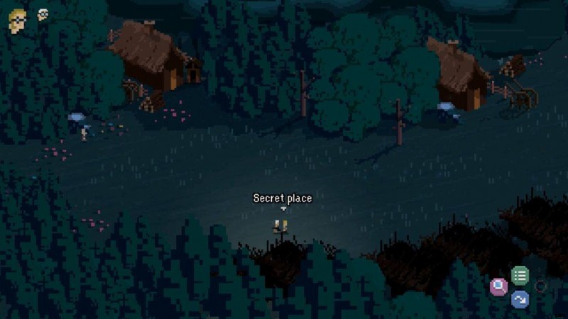 到達する必要がある場所は、2 つのキャビン (反乱軍のキャビンとアントンのキャビン) の間のオーバーワールド マップの最南端です。この 2 つの小屋の間をはるか南に行き、コンパスを調べて、ノートに記載されている座標に到達します。