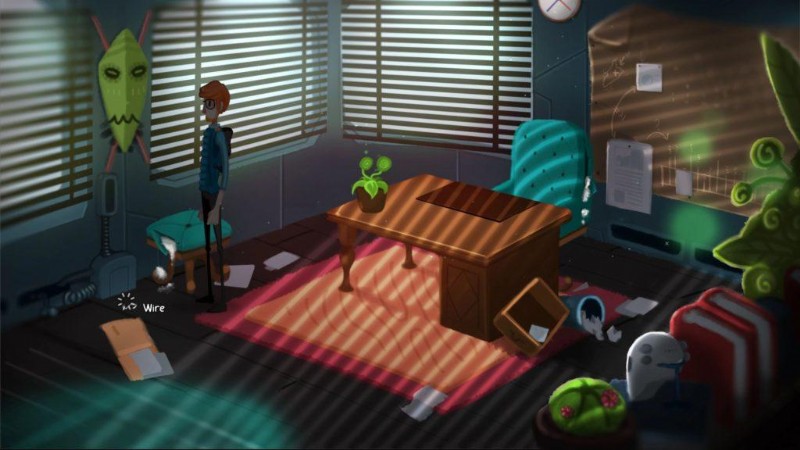 Totel のメモのペーパー クリップを使用して、そのようなアイテムを既に 1 つ持っています。他のアイテムについては、Totel のオフィスに戻り、画面の左側にある曲がった緑色のマスクを調べます。マスクをさらに数回使用してから、床に落ちた金属片を拾います。