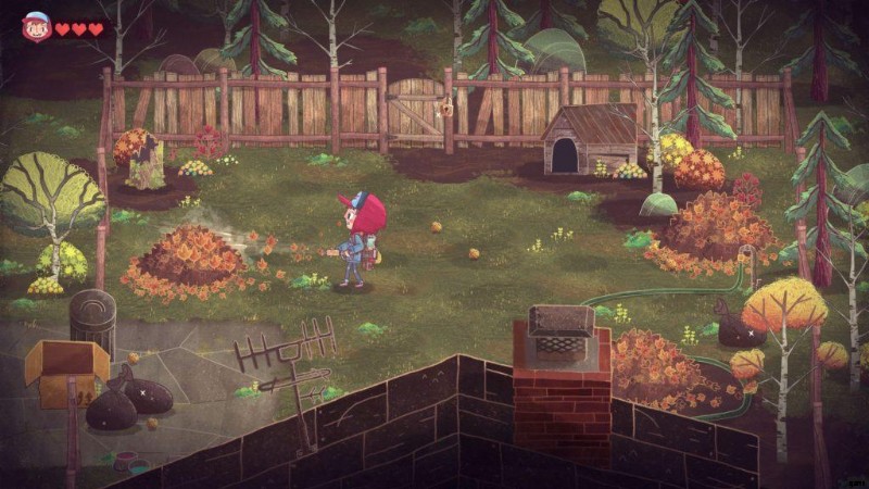ドアから出ます。犬小屋のすぐ南にある奇妙な物体を拾います。キーを取得するまで、茶色の葉の山にガストバスターを使用してください。