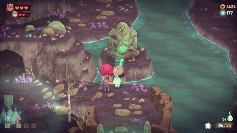 月の石の上にルナリングを5体投げて、腐敗を取り除きます。北東に向かい、カービィとしてガーディアン像のランタンを使って道を開けましょう。
