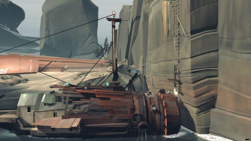 あなたの船が崖の表面に到達し、それ以上進むことができなくなったら、船から降りて頂上に行きます.船の前に向かい、崖の上のはしごを登ってください。