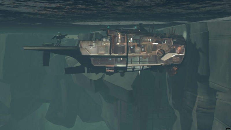 行く手を阻む黒いビームが見えるまで進みます。ホースに戻り、レバーを使ってバラスト タンクを少し空にします。そうすれば、船は梁の上に上がり、前進し続けることができます。