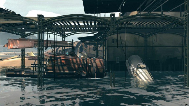 車両基地に近づいたら、屋根に当たらないようにマストを下げます。水に飛び込み、半分沈んだ石油タンカーの下を右に泳ぎましょう。