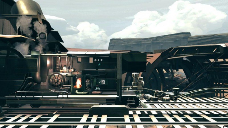 車内に荷物がまとまったら、車内の青いレバーを右にセットします。前の蒸気エンジンの手順を繰り返します:燃料を満たし、ふいごの上のボタンにジャンプし、ふいごに繰り返しジャンプして火室の火を起こします。