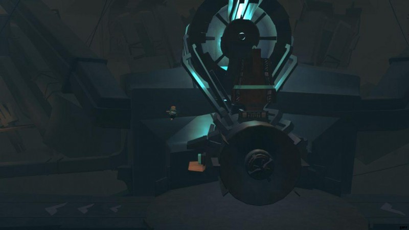 レバーの上のボタンを押してフックを下げ、壊れたコンポーネントをつかみます。レバーを左に押し続けて、原子炉の左側にあるライトアップされたレールの上に壊れたコンポーネントを移動します。