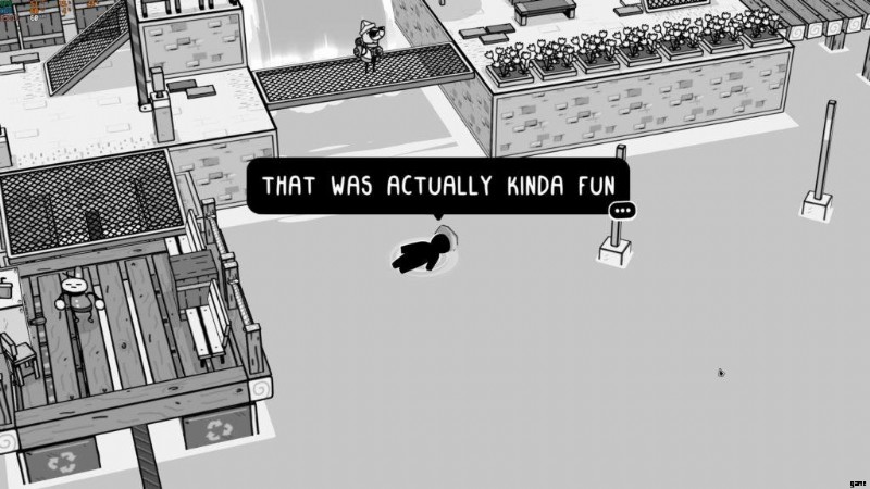 中に入って、水上の橋に行くと、端にぐらついている黒い輪郭の人がいます。彼の後ろでクラクションを鳴らして水中に送り込みましょう!