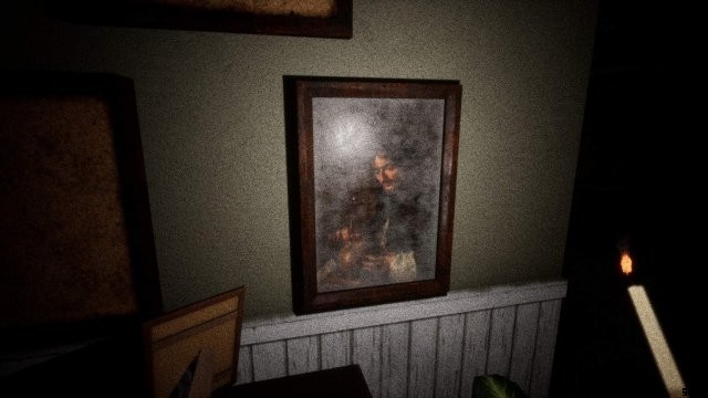 Examine the two photographs on the wall, the drawing on the floor, and the candle from the table. Interact with the door.