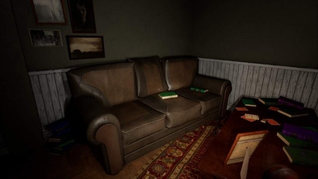 Pick up the lighter from the table. Interact with items until you hear a click. Go to the left of the room and look at the books, your character will get scared.
