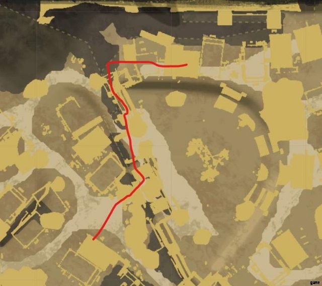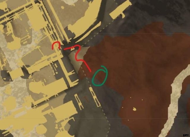 通路の終わりで、石の壁の棚に登る必要があります。私が知る限り、これらは最も難しいジャンプです。棚を左にたどり、角を曲がってジャンプします。うまくいけば、遠隔地にいる人に見られないことを願っています(伏せていると攻撃することはできませんが、ジャンプが難しくなります)別の高いところに行けるまで、棚をたどり続けますレベル。メイジはあなたに気付くかもしれませんが、あなたに地雷を使わない限り、彼らはすぐに忘れて戻ってきます. (また、ジャンプ後はできるだけ早く横になります。) 高いレベルに上がったら、左側に沿って進み、もう一方の出っ張りまで少し下ります。