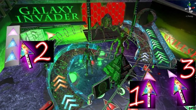 2番目の部分ですが、上の写真を見ると、矢印はテーブルの左後ろ隅にある金属製の傾斜路を指しています。その傾斜路には3つの矢印があります.上部の最初の矢印は、完全に別のミッションに関係しています。ギャラクシーインベーダーとは一切関係ありません。次の 2 つの青い矢印は、このミッションのパート 1 をクリアしたことを示す LED であり、ミッションの後半をアクティブにするための秘密の要件をクリアすると点滅し始めます。青い矢印が点滅している場合は、ボールをこのランプに 1 回ではなく 2 回ノックアップすることに集中する必要があります。それができたら、おめでとうございます。Galaxy Invader をクリアしたことになります。特別なオーディオ キューと大量のスコア ボーナスが得られます。