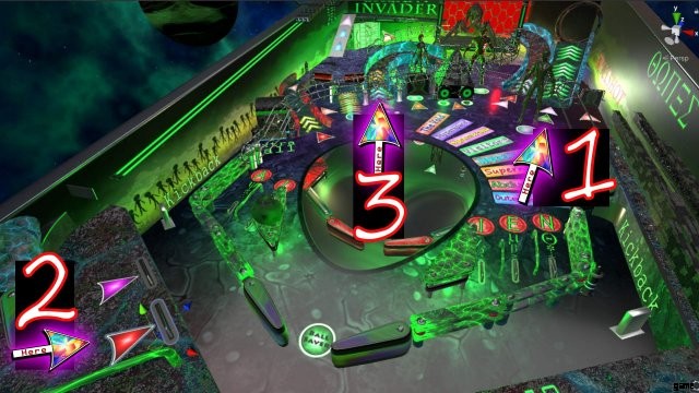 これは、一番下のプレイフィールド (巨大なエイリアンの顔) に到達するためのミッションです。このミッションを開始するには、ボールを排出するときに当たる右のスピナーを合計 12 回スピンする必要があります。これを完了すると、パート 2 が始まります。