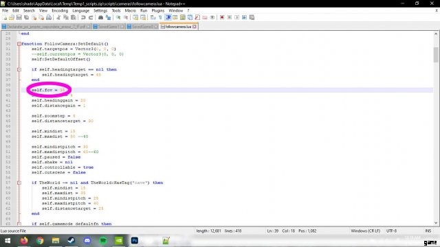 「C:ProgramFiles(x86)SteamsteamappscommonDon’tStarveTogetherdatadatabundlesscriptscameras」または DST をインストールした場所に移動します- メモ帳またはメモ帳++で「followcamera.lua」を開きます(初めての場合はアプリを選択してください)