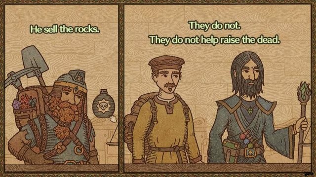 新しい一日の始まりに訪ねてくるドワーフ鉱山労働者から岩を購入できます。代わりに、仲間の錬金術師またはジャック (すべての取引の) に出くわす可能性があります。