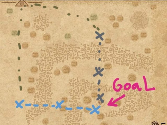 横から入れるか、上から入れるかに応じて、ポーションをできるだけジャンプポイントに近づけるために、他の材料を調合します。 X は、岩を使ってジャンプするおおよそのエリアを表しています。