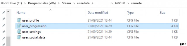 steam フォルダにある user_progression ファイルを削除し、EGS user_progression.dat に置き換えます。ファイルの名前を .dat から .cfg に変更します。