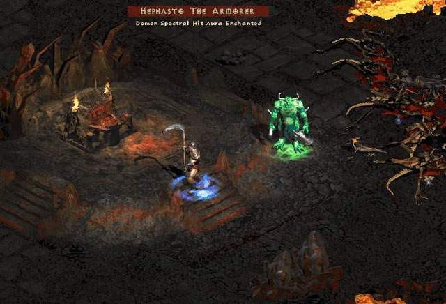 アーマラーのヘファスト:炎の川のヘルフォージを守る超ユニークなモンスター、オーラ エンチャント、スペクトラル ヒット、魔法耐性。彼は近距離で強く打て、速いです。彼はオーラ能力のためにほとんど危険です.傭兵を殺すときは餌として使ってみてください。