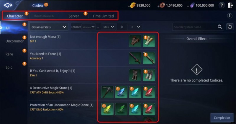 - コーデックスを完了するとキャラクターのステータスが増加し、サーバー コーデックスはその効果をサーバー内のすべてのキャラクターに適用します。