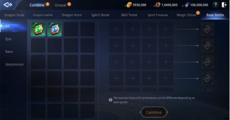 - 各組み合わせレベルの昇格チャンスは、レアの試技で 10%、エピックの試技で 7% です。