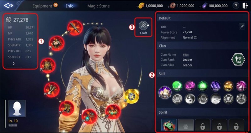称号/パワー スコア/属性/クラン/スキル/スピリット情報を表示します。