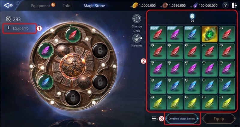 メニューのキャラクター – 魔石をタップするか、装備ウィンドウの左上にある魔石タブをクリックしてください。
