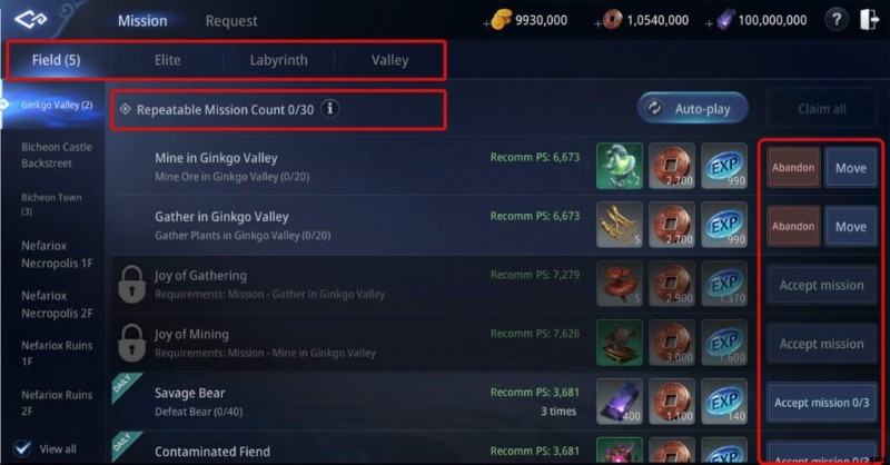 - 利用可能なミッション タイプはフィールド、エリート、ラビリンス、バレーで、1 回限りのミッションと繰り返し可能なミッションがあります。