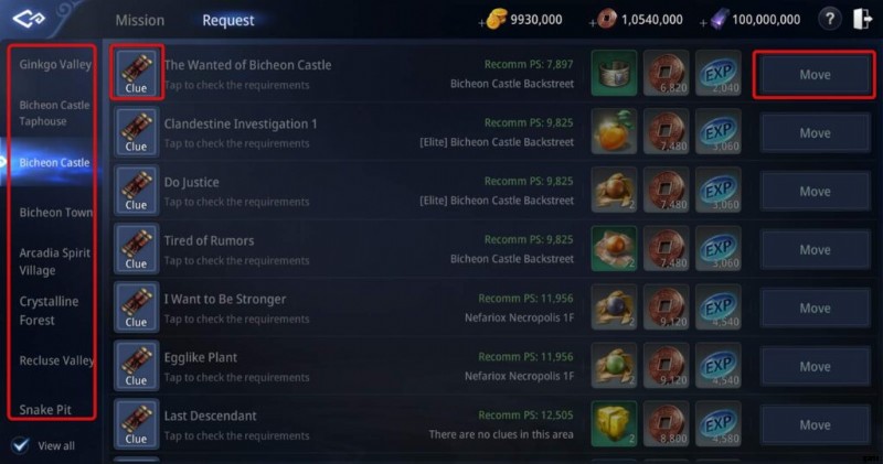 - 各エリアから依頼を受け、未挑戦の依頼の手がかりを見ることができます。