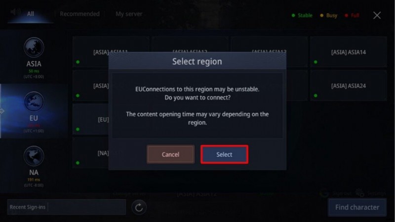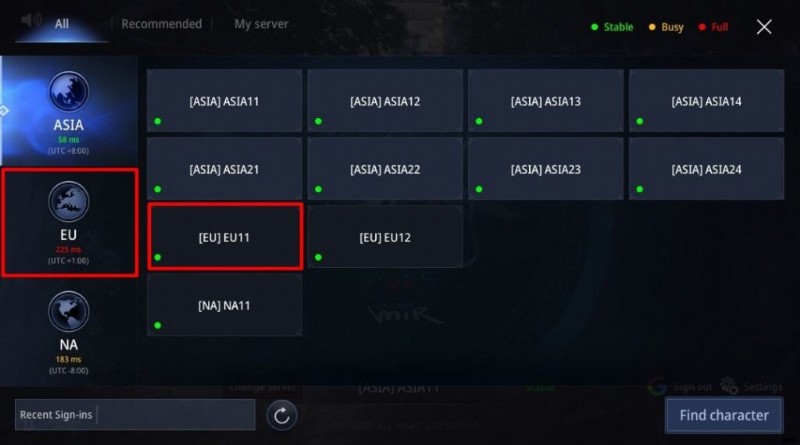 MIR4 には [ASIA]、[EU]、[NA] リージョンがあり、各リージョンには複数のサブサーバーがあります。