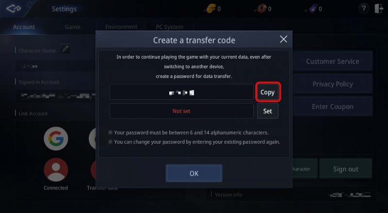 - [データ転送]> [転送コード] から取得したコードをコピーし、メモ帳ファイルなどに保存します。