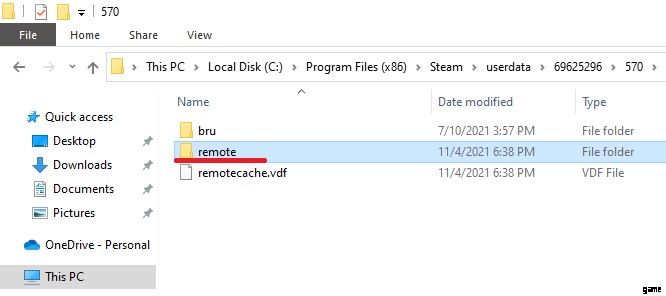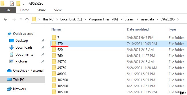 プレイ/インストールしたゲームによっては、この中にいくつかのフォルダーがある場合があります。各フォルダはゲームであり、その名前はゲーム ID を表します。 Dota 2 Steam ゲーム ID である「570」という名前のフォルダーにアクセスします。