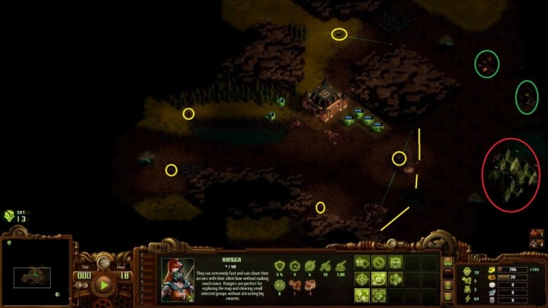 この画面では、兵士が黄色で丸で囲まれ、放棄されたリソースと建物が緑色で丸で囲まれ、破滅の村が赤で丸で囲まれていることがわかります。東は拡張するのに非常に適した方向であるため、これは大きな問題です(石、および住居を配置するための多くの部屋)。つまり、レンジャーをこのエリアの常駐パトロールに残し、壁に備える必要があります (黄色の線を参照してください)。