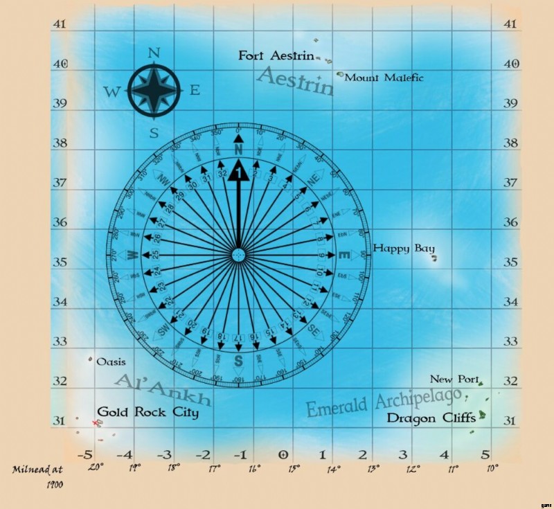 経度は決定するのがより難しい値であり、ゲームや歴史的に、Sailwinds では -5 から +5 に関連しています。