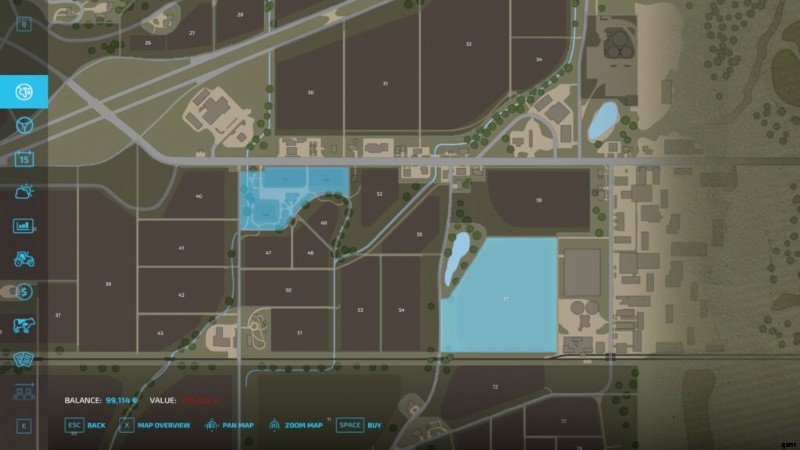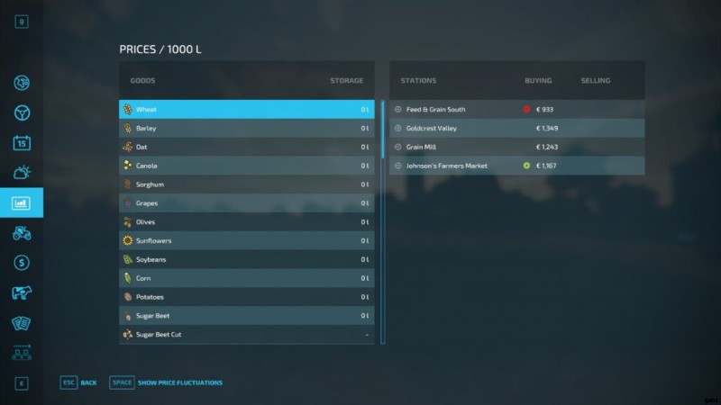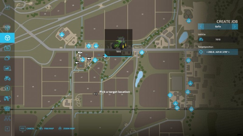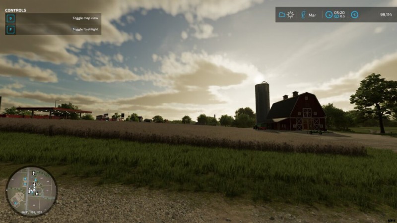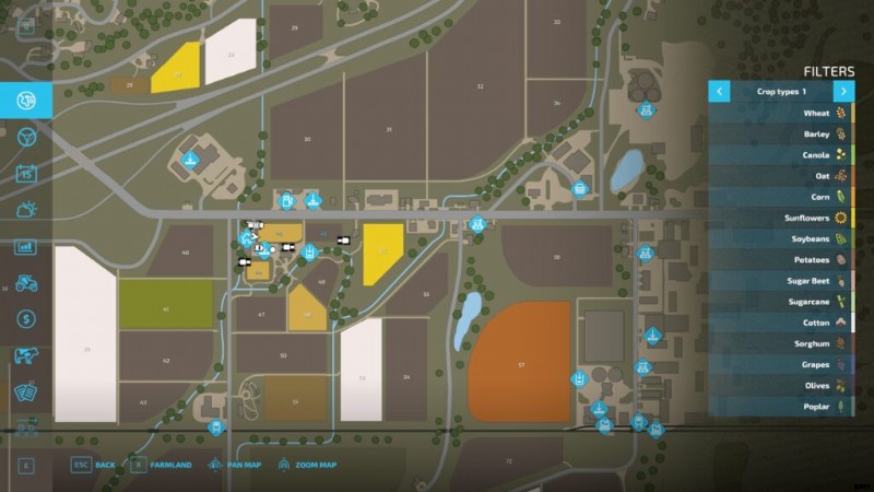 - ミニマップ もちろんオリエンテーションにも役立ちます。メニューの大きなマップと同じように、すべてのマシンとツールがアイコンとして表示され、所有しているフィールドは色付きの数字でマークされ、訪問する場所にタグを付けると、ミニマップで点滅して行き先がわかります.