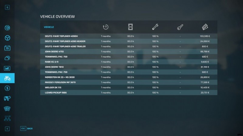 - 車内 、速度計、車両の燃料残量とその状態が表示されます。時間が経つにつれて、マシンはメンテナンスが必要になります。速度計の左側には、選択した機械の充填レベルが表示されます。たとえば、播種機に残った種子や収穫機のタンクに収穫された作物などです。